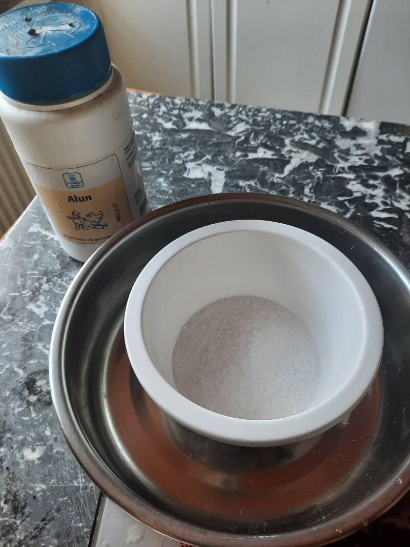 Før ulden farves, skal den bejdses. Det er en proces, som åbner fibrene og fjerner fedt eller andre aflejringer, så farven bedre kan trænge ind. Alun, et ugiftigt salt, bruges i en koncentration på ca. 15 %. Til 100 g uld skal man bruge 15 g alun. Det skal først opløses i en lille skål med lidt vand. Derefter kan du komme det i gryden med ulden og fylde den op med koldt vand. Ulden skal kunne flyde og ikke være for tæt pakket i gryden, og den skal helst ikke stikke op af vandet. Hvis den gør det, skal du røre forsigtigt rundt flere gange, så farven kan komme alle steder.