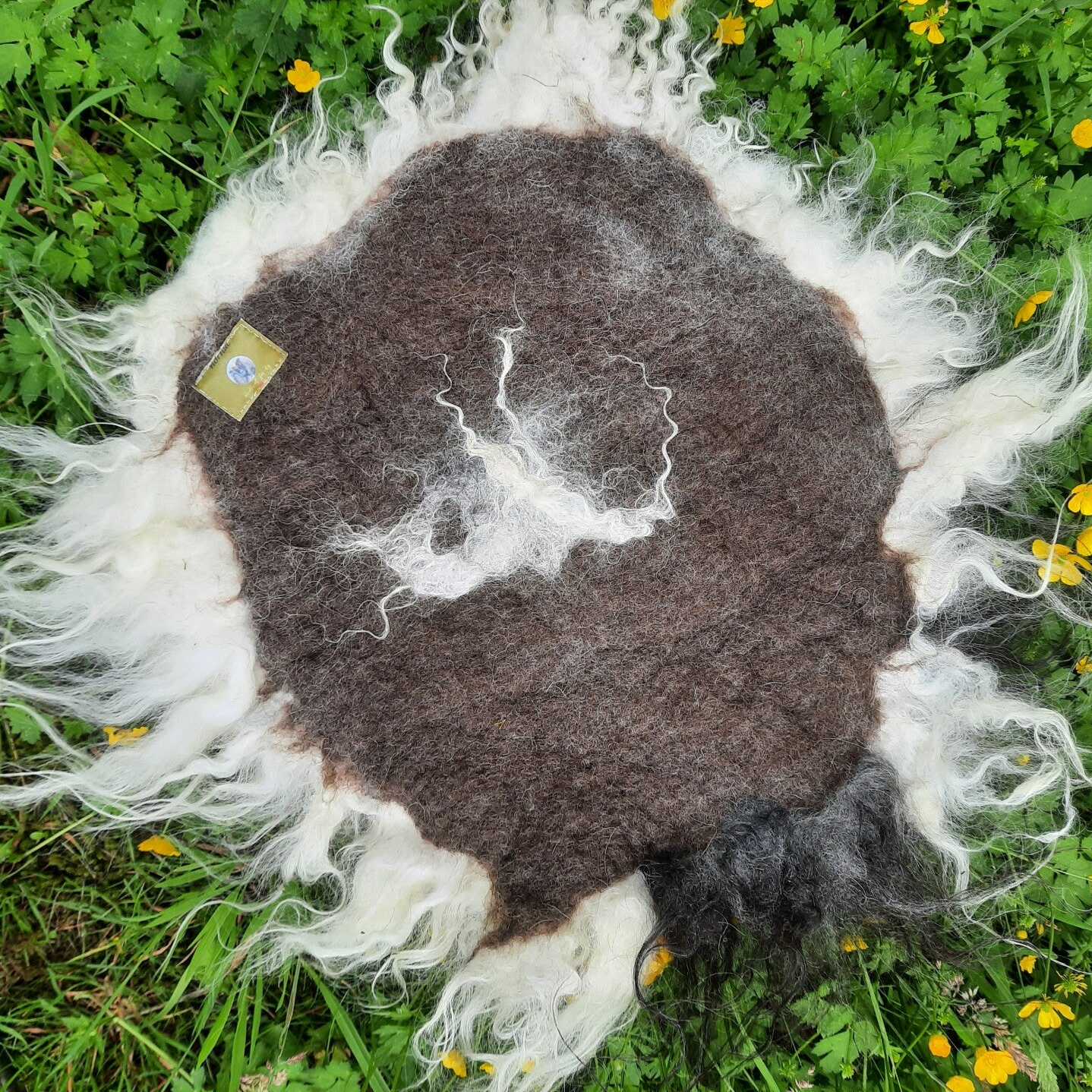 Dette skønne skind er filtet af ulden fra Spælsau får med blødt og let krøllet hår. To dejlige farvenuancer, som er skabt af naturen, gør dette skind til et helt individuelt stykke. Kan du måske se et fårehoved i mønstret? ;-)