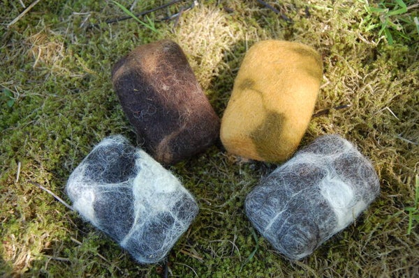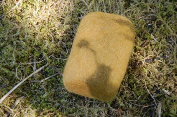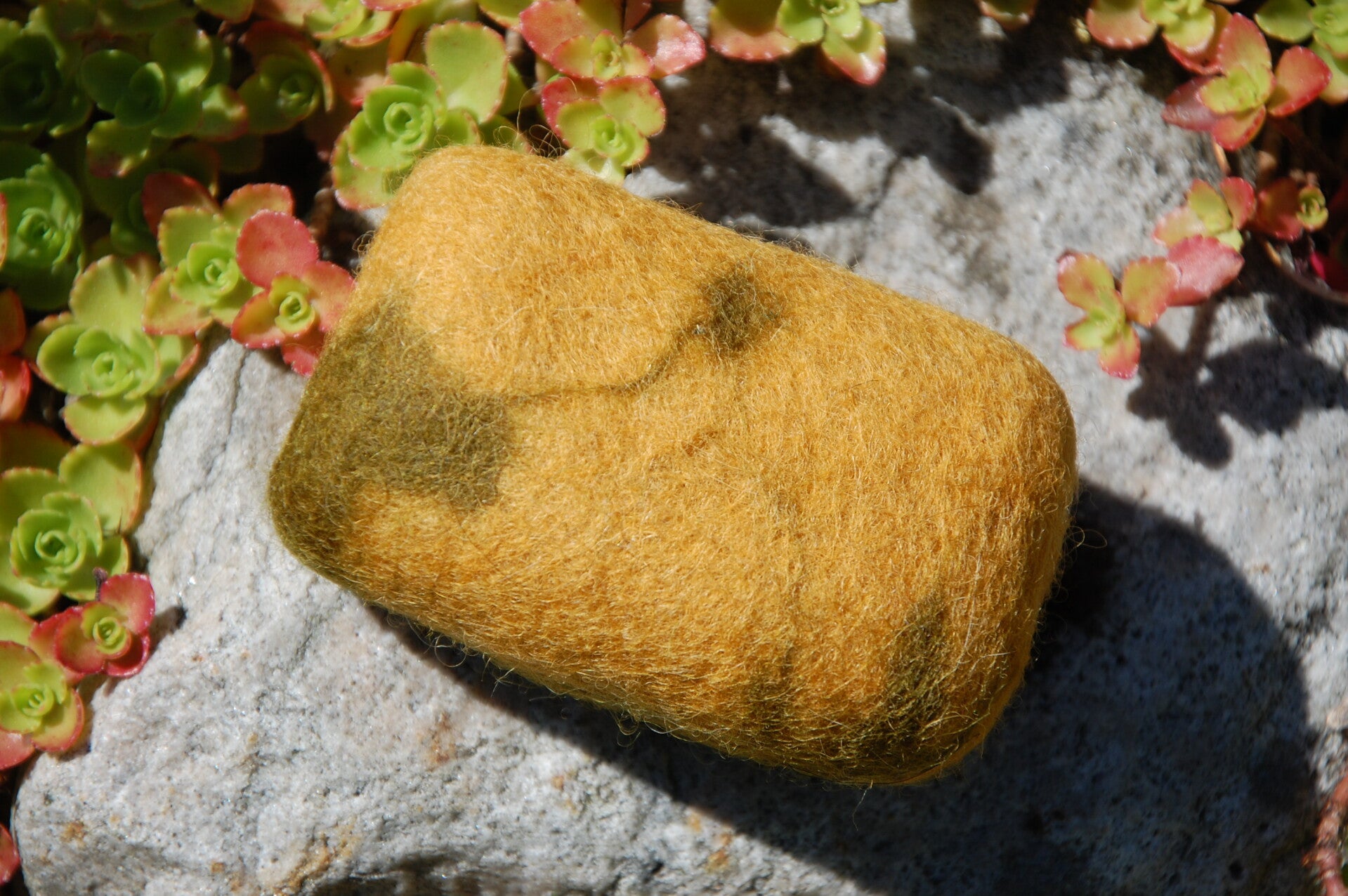 Sæbe med en frakke af gul farvet spelsau uld og en strejf af grøn. Ulden er farvet med rajnfan.