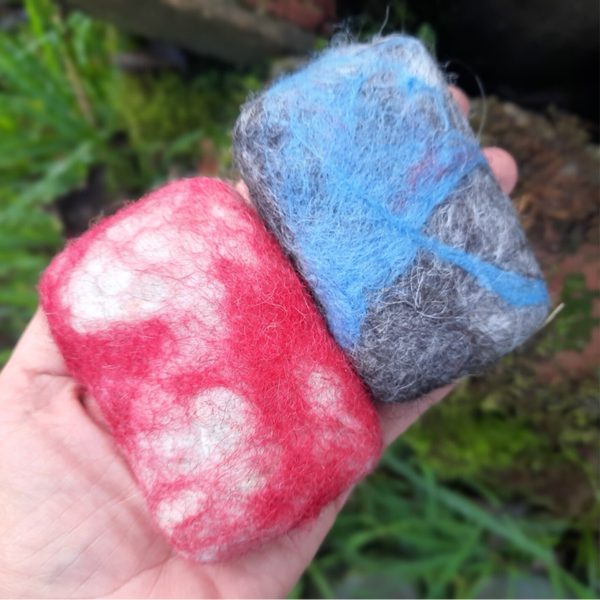 Sæbe med en frakke af hvid spelsau uld og pink tiroler bergfår uld.